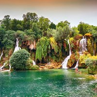 The Waterfalls at Kravice are a series of cascading waterfalls located in the Herzegovina region. The falls are fed by the Trebižat River and are surrounded by lush greenery and rocky cliffs. The area is a popular destination for swimming, picnicking, and hiking.